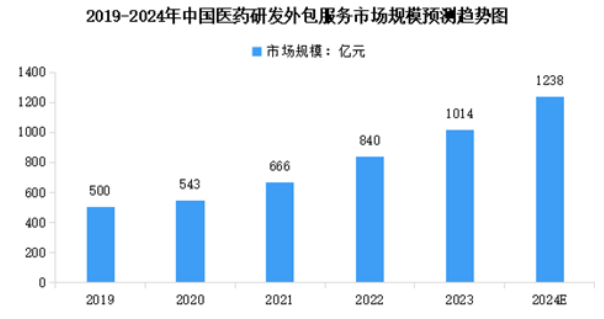 隨著中國(guó)醫(yī)藥行業(yè)的快速發(fā)展,尤其是創(chuàng)新藥研發(fā)的興起,對(duì)CRO服務(wù)的需求不斷增加,國(guó)內(nèi)醫(yī)藥CRO市場(chǎng)規(guī)模呈快速增長(zhǎng)態(tài)勢(shì)。2023年中國(guó)醫(yī)藥研發(fā)外包服務(wù)(CRO)市場(chǎng)規(guī)模達(dá)到1014億元,2019-2023年的年均復(fù)合增長(zhǎng)率達(dá)19.35%。2024年市場(chǎng)規(guī)模將增長(zhǎng)至1238億元。