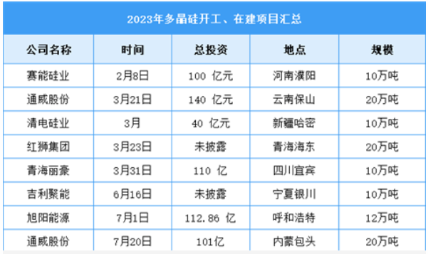 在建多晶硅規(guī)?捎^。賽能硅業(yè)河南濮陽10萬噸、云南通威二期20萬噸、清電硅業(yè)哈密一期10萬噸、紅獅集團(tuán)(亞洲硅業(yè))青海海東一期10萬噸、麗豪半導(dǎo)體宜賓10萬噸、吉利聚能寧夏10萬噸、旭陽能源12萬噸、內(nèi)蒙古通威20萬噸、其亞硅業(yè)新疆二期10萬噸、新疆晶暉年產(chǎn)2×10萬噸一期、南玻A青海海西5萬噸等項(xiàng)目皆以啟動、開工,預(yù)計(jì)2024年將有117萬噸多晶硅產(chǎn)能釋放。