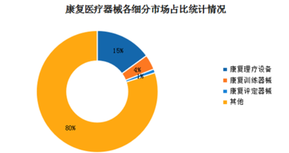 目前,康復(fù)理療設(shè)備、康復(fù)訓(xùn)練器械、康復(fù)評(píng)定器械是康復(fù)醫(yī)療器械的三大細(xì)分市場(chǎng)。其中,康復(fù)理療設(shè)備主要是指用于幫助患者恢復(fù)身體功能的設(shè)備,如按摩椅、電療儀等,市場(chǎng)占比為15%;康復(fù)訓(xùn)練器械是指用于幫助患者進(jìn)行康復(fù)訓(xùn)練的設(shè)備,如輪椅、假肢等,占比約為4%;康復(fù)評(píng)定器械是指用于評(píng)估患者康復(fù)情況的設(shè)備,如運(yùn)動(dòng)檢測(cè)儀、神經(jīng)電生理檢測(cè)儀等,占比僅為4%。