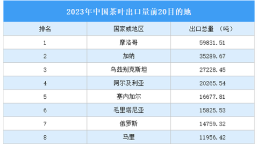 2023年,中國茶葉出口總量36.75萬噸,同比減少2.06%;中國茶葉共銷往130個國家和地區(qū)。出口量超萬噸的目的地共計10個,出口量超2萬噸的目的地共計4個。其中,摩洛哥繼續(xù)排名第一位,茶葉出口量5.98萬噸,加納、烏茲別克斯坦排名第二和第三,出口量分別為3.53萬噸、2.72萬噸。