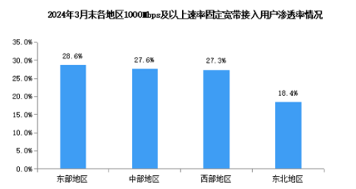 截至3月末,東、中、西部和東北地區(qū)1000Mbps及以上固定寬帶接入用戶滲透率分別為28.6%、27.6%、27.3%和18.4%。京津冀、長(zhǎng)三角地區(qū)1000Mbps及以上接入速率的寬帶接入用戶滲透率分別為29.8%、27.1%,較1—2月份分別提升1.2個(gè)和0.7個(gè)百分點(diǎn)。