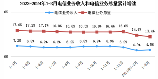 一季度,電信業(yè)務收入累計完成4437億元,同比增長4.5%,增速較1—2月份提升0.2個百分點。按照上年不變價計算的電信業(yè)務總量同比增長13.4%。