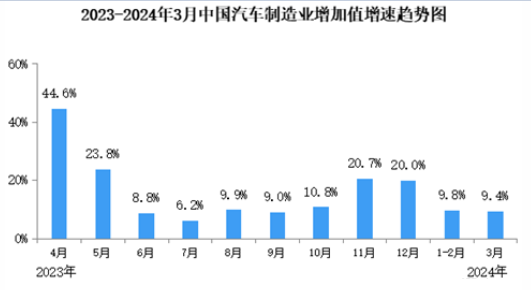 2024年3月,中國規(guī)上汽車制造業(yè)增加值增長9.4%,環(huán)比回落0.4個百分點(diǎn)。2024年1-3月,中國規(guī)上汽車制造業(yè)增加值增長9.7%。