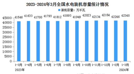 2024年1-3月,中國水電累計裝機(jī)容量42340萬千瓦,同比增長1.9%。新增水電裝機(jī)容量181萬千瓦,同比減少90萬千瓦。