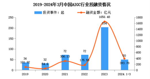 在政策推動(dòng)與技術(shù)應(yīng)用落地等多方位因素驅(qū)動(dòng)下,我國AIGC行業(yè)正迎來新的風(fēng)口。從2021年起,國內(nèi)AIGC投融資市場投資熱情高漲。2023年投資事件達(dá)204起,已披露融資金額達(dá)1656.48億元,為歷史新高。2024年第一季度,投資事件達(dá)50起,已披露融資金額達(dá)393.78億元。