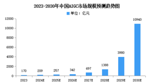中國AIGC市場是全球AIGC市場的主要組成部分,中國AIGC市場受強(qiáng)大的市場需求及增強(qiáng)的AI技術(shù)所推動。2023年中國AIGC市場規(guī)模約為170億元, 2030年AIGC市場規(guī)模將超萬億元。