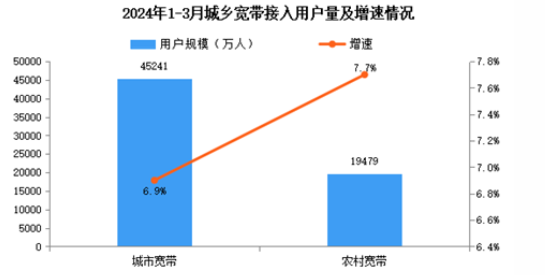2024年1-3月城市寬帶接入用戶達45241萬人,同比增長6.9%。農(nóng)村寬帶接入人數(shù)達19479萬人,同比增長7.7%。