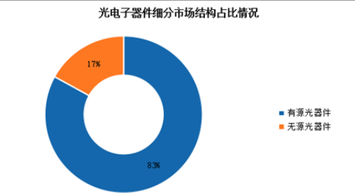 光電子器件按照是否需要外部能源來(lái)工作,可分為有源光器件和無(wú)源光器件兩類。有源光器件占比83%,主要用于光電轉(zhuǎn)換或光信號(hào)處理,包括激光器、光探測(cè)器、光放大器、光開(kāi)關(guān)、光調(diào)制器、光顯示器件等;無(wú)源光器件占比較小,約17%,包括光纖連接器、耦合器、波分復(fù)用器、光隔離器、光衰減器、光分路器、光濾波器等。