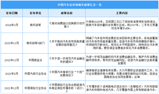 近年來,中國汽車后市場行業(yè)受到各級政府的高度重視和國家產(chǎn)業(yè)政策的重點支持。國家陸續(xù)出臺了多項政策,鼓勵汽車后市場行業(yè)發(fā)展與創(chuàng)新,《推動消費品以舊換新行動方案》《關(guān)于推動汽車后市場高質(zhì)量發(fā)展的指導(dǎo)意見》《關(guān)于進一步規(guī)范汽車金融業(yè)務(wù)的通知》等產(chǎn)業(yè)政策為汽車后市場行業(yè)的發(fā)展提供了明確、廣闊的市場前景,為企業(yè)提供了良好的生產(chǎn)經(jīng)營環(huán)境。