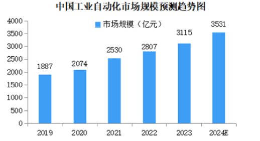 我國(guó)工業(yè)自動(dòng)化行業(yè)起步較晚,但發(fā)展勢(shì)頭強(qiáng)勁。雖然我國(guó)工業(yè)自動(dòng)化在關(guān)鍵的核心技術(shù)方面與外資品牌有顯著差距,但近年來(lái)國(guó)家陸續(xù)頒布的一系列法規(guī)政策為我國(guó)工業(yè)自動(dòng)化行業(yè)的發(fā)展提供了強(qiáng)勁的動(dòng)力。中國(guó)工業(yè)自動(dòng)化行業(yè)取得明顯進(jìn)步,國(guó)產(chǎn)替代進(jìn)程加快。數(shù)據(jù)顯示,2023年中國(guó)工業(yè)自動(dòng)化市場(chǎng)規(guī)模達(dá)3115億元,較2022年同比增長(zhǎng)約11%。2024年中國(guó)工業(yè)自動(dòng)化市場(chǎng)規(guī)模將增至3531億元
