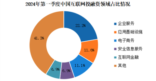 2024年第一季度,中國互聯(lián)網(wǎng)融資倫次中企業(yè)服務領域占比最多,共42筆,占比達22.2%;應用基礎設施領域排名第二,投融資22筆,占比11.6%。其次分別為電子商務、安全信息服務、互聯(lián)網(wǎng)金融,占比分別為11.1%、6.9%、6.9%。
