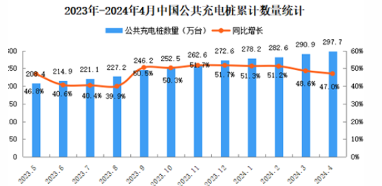截至2024年4月,全國公共充電樁297.7萬臺,環(huán)比增加6.8萬臺,同比增長47.0%。其中直流充電樁131.5萬臺、交流充電樁166.1萬臺。從2023年5月到2024年4月,月均新增公共充電樁約7.9萬臺。