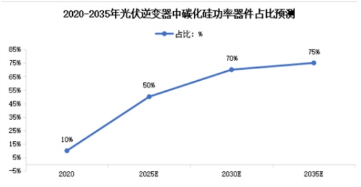 在光伏發(fā)電應(yīng)用中,基于硅基器件的傳統(tǒng)逆變器成本約占系統(tǒng)10%左右,卻是系統(tǒng)能量損耗的主要來源之一。使用碳化硅 MOSFET 或碳化硅 MOSFET 與碳化硅 SBD 結(jié)合的功率模塊的光伏逆變器,轉(zhuǎn)換效率可從 96%提升至 99%以上,能量損耗降低 50%以上,設(shè)備循環(huán)壽命提升 50 倍,從而能夠縮小系統(tǒng)體積、增加功率密度、延長器件使用壽命、降低生產(chǎn)成本。高效、高功率密度、高可靠和低成本是光伏逆變器的未來發(fā)展趨勢。