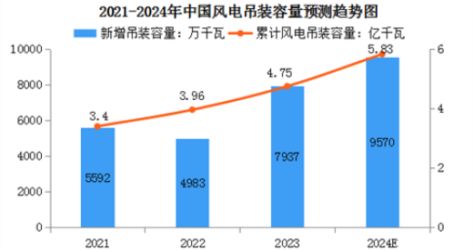 風(fēng)電吊裝容量是指在一定時(shí)期內(nèi),風(fēng)電項(xiàng)目中安裝并吊裝到位的風(fēng)力發(fā)電機(jī)組的總裝機(jī)容量,反映了風(fēng)電行業(yè)在特定時(shí)間內(nèi)的建設(shè)活躍度和擴(kuò)張速度。2023年,全國(guó)(除港、澳、臺(tái)地區(qū)外)風(fēng)電吊裝新增裝機(jī)14187臺(tái),新增吊裝容量7937萬(wàn)千瓦,同比增長(zhǎng)59.3%。截至2023年底,全國(guó)累計(jì)風(fēng)電吊裝裝機(jī)超過(guò)19.5萬(wàn)臺(tái),累計(jì)吊裝容量達(dá)4.75億千瓦,同比增長(zhǎng)20%。2024年全國(guó)累計(jì)風(fēng)電吊裝容量將超5億千瓦。