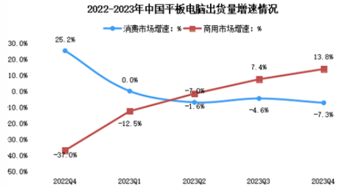 2024年第一季度,平板電腦消費市場同比增長6.3%,商用市場同比增長10.7%。消費市場和商用市場均為正向增長。