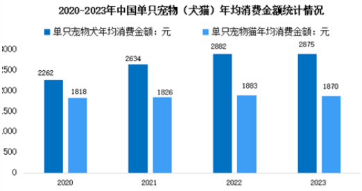 2023年,單只犬年平均消費(fèi)2875元,同比下降0.2%;單只貓年均消費(fèi)1870元,同比下降0.7%。犬貓年均消費(fèi)金額相差較大。