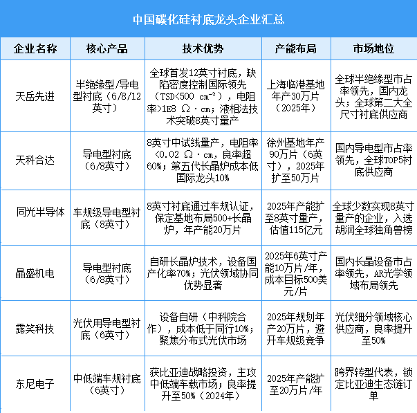 中國(guó)碳化硅外延行業(yè)競(jìng)爭(zhēng)格局呈現(xiàn)“一超多強(qiáng)”態(tài)勢(shì),其中瀚天天成與東莞天域并稱“雙雄”,二者均已實(shí)現(xiàn)8英寸碳化硅外延片的批量供應(yīng),技術(shù)實(shí)力領(lǐng)跑行業(yè),且均獲華為哈勃投資,二者合計(jì)占據(jù)國(guó)內(nèi)市場(chǎng)超70%份額;此外,普興電子、中電科13所、中電科55所等企業(yè)也具備較強(qiáng)競(jìng)爭(zhēng)力,在特定領(lǐng)域或細(xì)分市場(chǎng)占據(jù)一席之地。