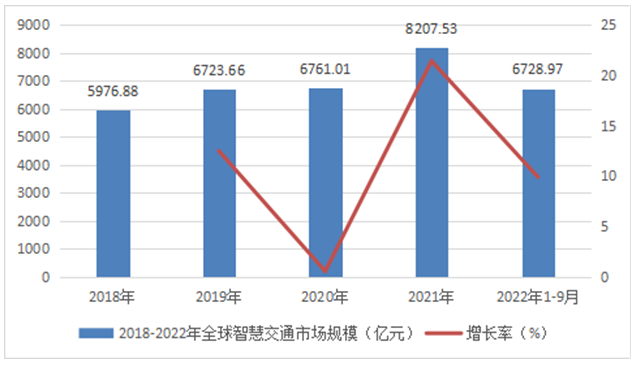 統(tǒng)計數(shù)據(jù)顯示,2018年全球智慧交通市場規(guī)模為5976.88億元,2021年全球智慧交通市場規(guī)模為8207.53億元。2018-2022年全球智慧交通市場規(guī)模如下: