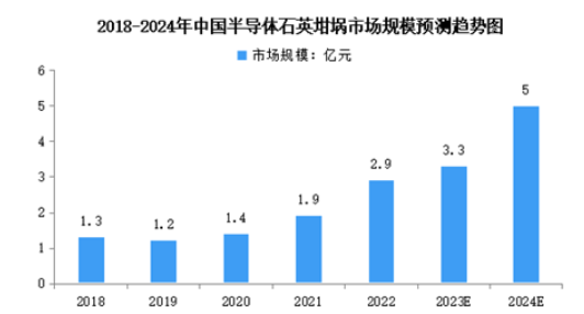 隨著我國半導體硅片產(chǎn)業(yè)的蓬勃發(fā)展,半導體石英坩堝市場需求也持續(xù)增長,2022年我國半導體石英坩堝需求量占全球需求總量的15.93%,推動市場規(guī)模增長。2018-2022年,中國半導體石英坩堝市場規(guī)模由1.3億元增長至2.9億元,復合年均增長率達22.8%。2024年我國半導體石英坩堝市場規(guī)模將達5億元。