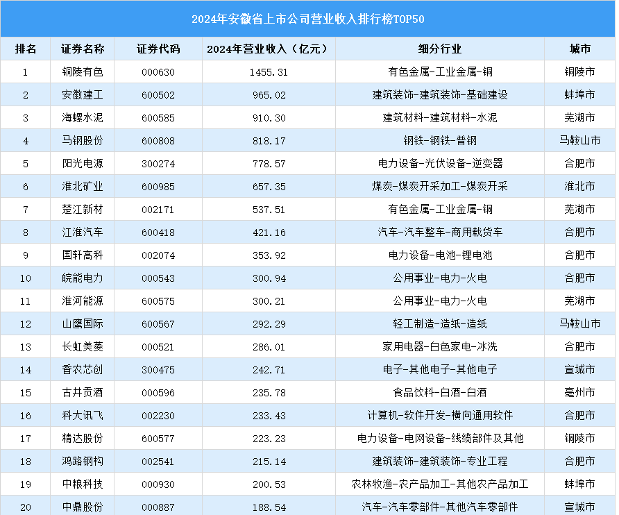 榜單中,銅陵有色、安徽建工、海螺水泥位列前三,馬鋼股份、陽光電源、淮北礦業(yè)、楚江新材、江淮汽車、國軒高科和皖能電力躋身前十。2024年安徽省上市公司營業(yè)收入前50名共累計實現(xiàn)營業(yè)收入12460.01億元。以下是2024年安徽省上市公司營業(yè)收入排行榜: