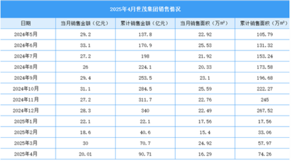 2025年4月世茂集團銷售簡報:銷售金額約20.01億元