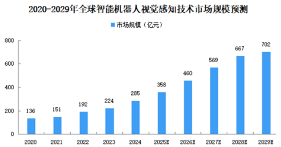 視覺感知技術(shù)是智能機器人感知技術(shù)應(yīng)用最廣泛、滲透率最高的類型。近年來,全球智能機器人視覺感知技術(shù)市場快速增長。2020年全球智能機器人視覺感知技術(shù)市場規(guī)模136億元,2024年市場規(guī)模增至285億元,年均復(fù)合增長率20.3%。2025年全球智能機器人視覺感知技術(shù)市場規(guī)模將達(dá)358億元,2029年將突破700億元。